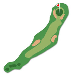 特設ティ:前進4打 セカンドより下って落下地点が見えにくい。 左右のクロスバンカーまで約200Y。 飛びすぎるとセカンドで左足下がりになり、打ちにくい。 右側OBに注意。