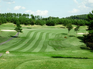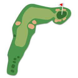 特設ティ:前進4打 右ドッグレッグのミドルホール。 ティショットは安全に左サイド狙い。 右側OBは見た目より近いので要注意。 飛ばし屋はショートカットで1オン可能だが、 前組プレーヤーにご注意。