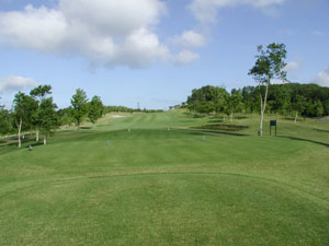 ティショットからやや打ち上げていくロングホール。 フェアウェイは広めでOBにならないので気持よく打とう。 ツーオンは無理なのでセカンドは手堅く3オン狙いで、2打目は右側の山すそ狙い。