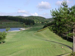特設ティ:前進4打(OB)、前進3打(池) 左側は大きな池とバンカーに注意。 右はOBだが山すそ狙いで、飛ぶ人は林向こうの斜面に打てると、距離がでる。 グリーンはピン奥から難しいので手前から攻める。