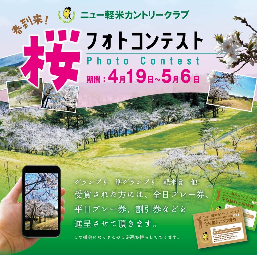 皆様、大変お待たせいたしました。今シーズンも、ご満足いただけるように、従業員全員で一生懸命頑張ります!今年も、桜の季節がやって参りました。昨年も4月19日から桜フォトコンテストを開催させていただきましたが、今年も、実施いたします!軽米の桜で春を満喫してください!フォトコンテストの応募方法・賞品は改めて、LINE、ゴルフ場ホームページでご案内させていただきます。ですが、桜が咲く前のプレーに、ぜひ当ゴルフ場をご予約ください。そして、桜がいつ頃満開になるかを予想して、その日付で、早めにご予約ください。